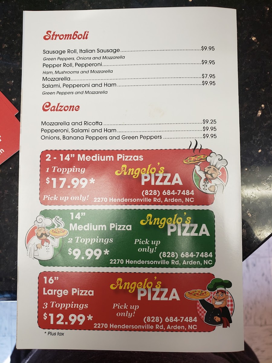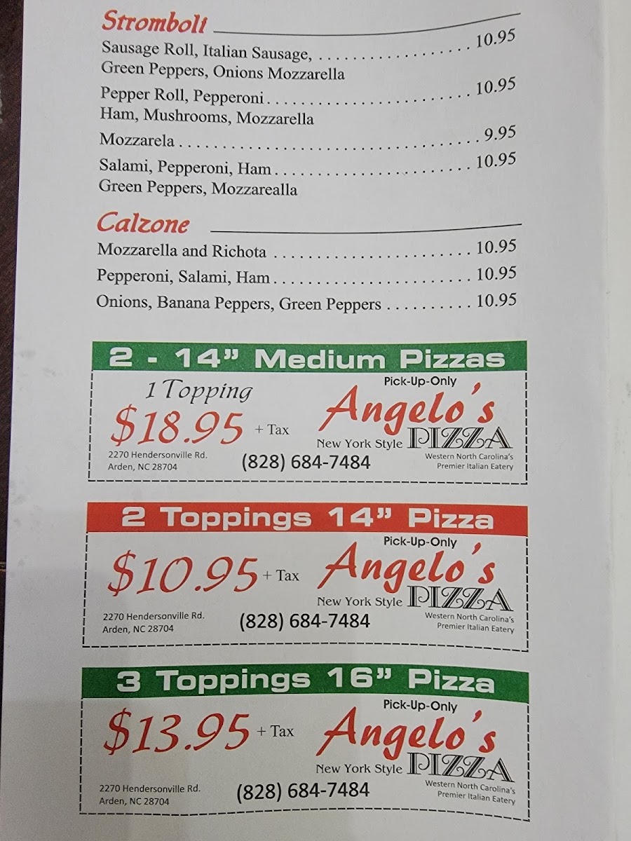 Angelo’s Pizza Located at 2270 Hendersonville Rd in Arden, North Carolina, Angelo’s Pizza offers a welcoming neighborhood pizzeria experience built around classic Italian-American comfort food. The menu features a wide variety of handcrafted pizzas, baked pasta dishes, hearty subs, crisp salads, and flavorful appetizers. Guests can pair their meals with soft drinks, iced tea, and other refreshing beverages that complement the rich, savory flavors of traditional pizzeria favorites.